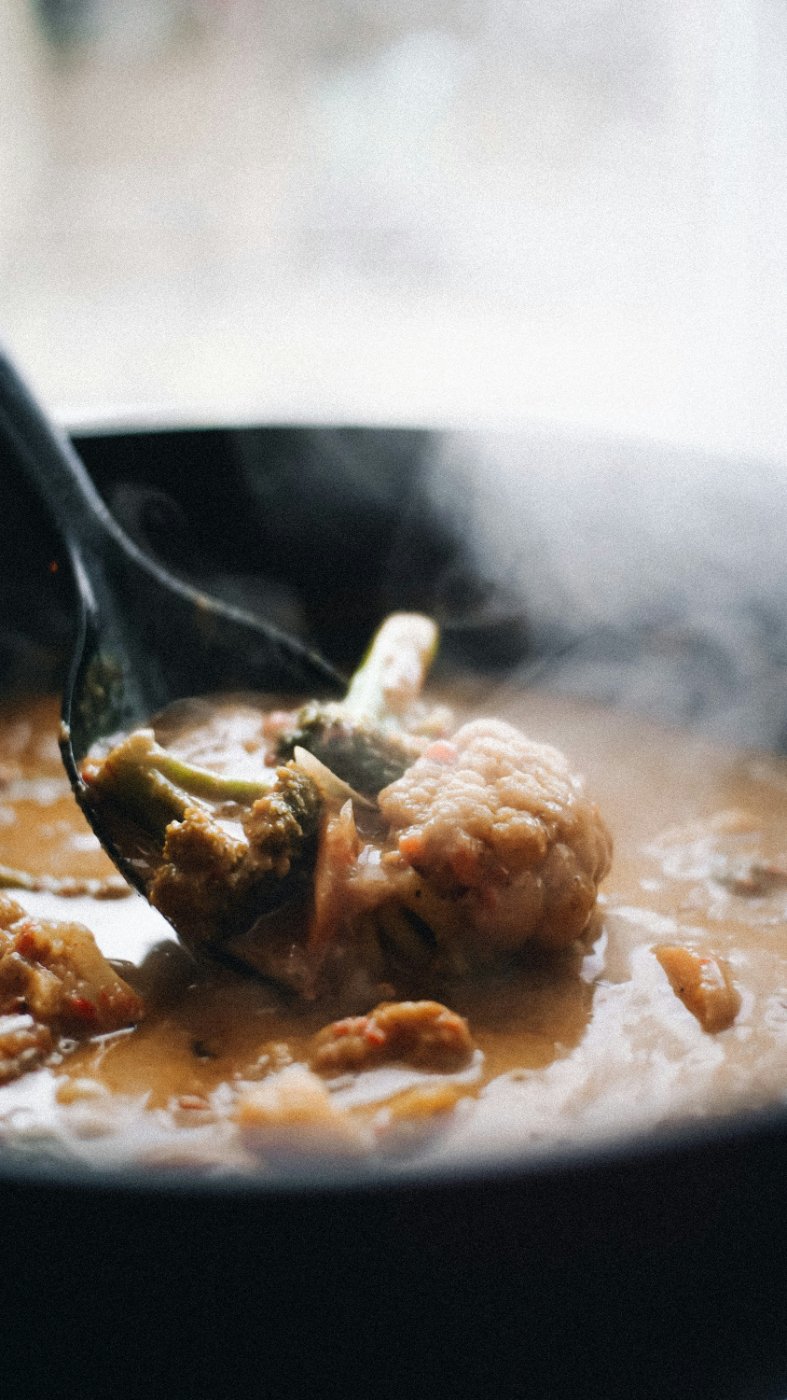 Roer bloemkool en eiwitpoeder erdoor en serveer met naan of rijst.