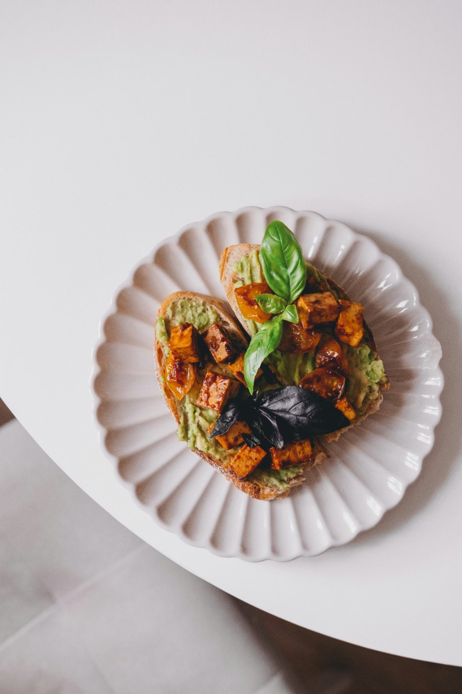 Besmeer de toast met avocado, verdeel de gebakken tofu erover en garneer met verse basilicum.