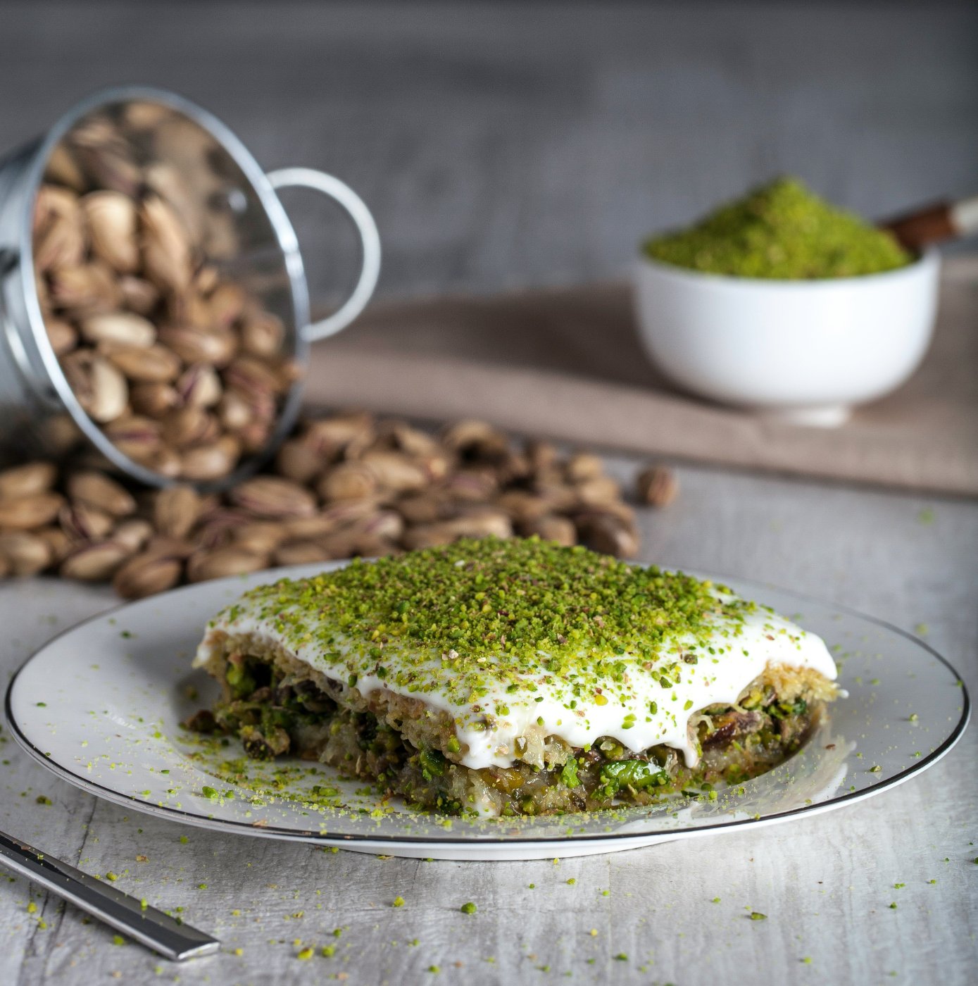 Herhaal tot alles op is. Eindig met een laag crème en pistachenoten.