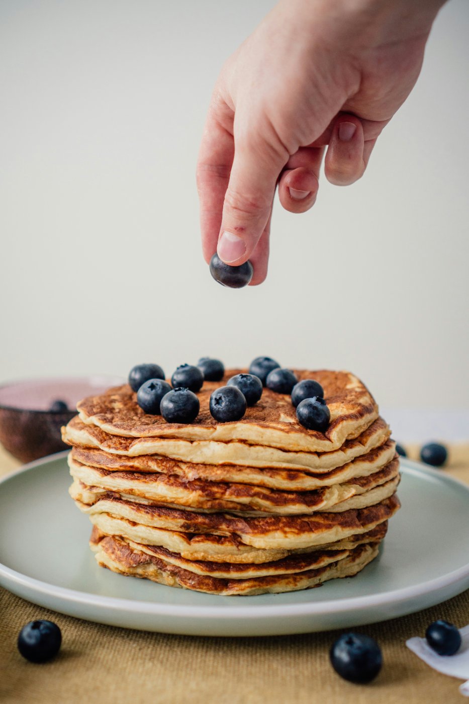 Verhit een pan met kokosolie en bak de pannenkoeken in porties tot ze goudbruin zijn.